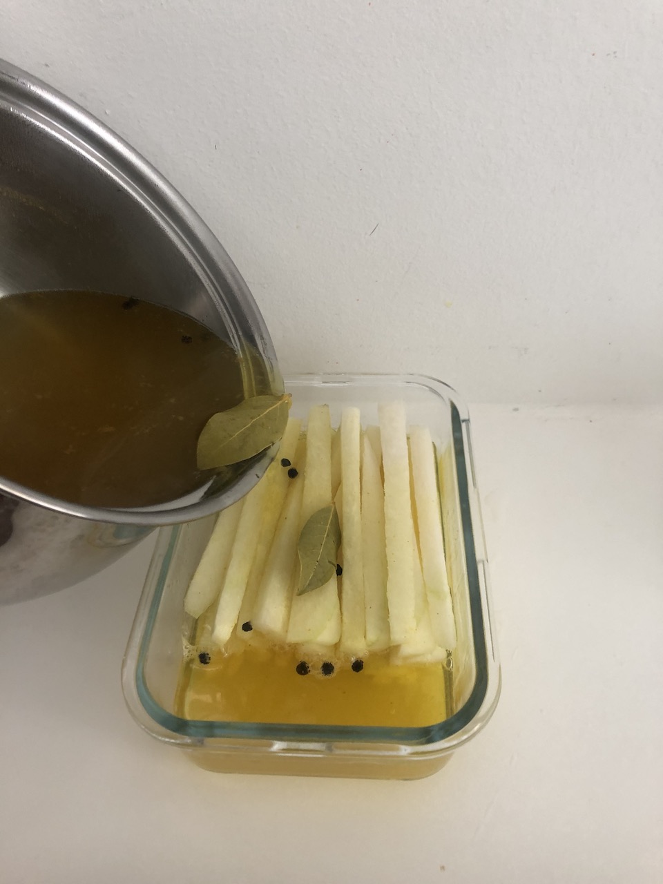 - Hæld den kogende syltemarinade over kinaradisen og vent med at sætte låg på. Sæt på køl efter afkøling.