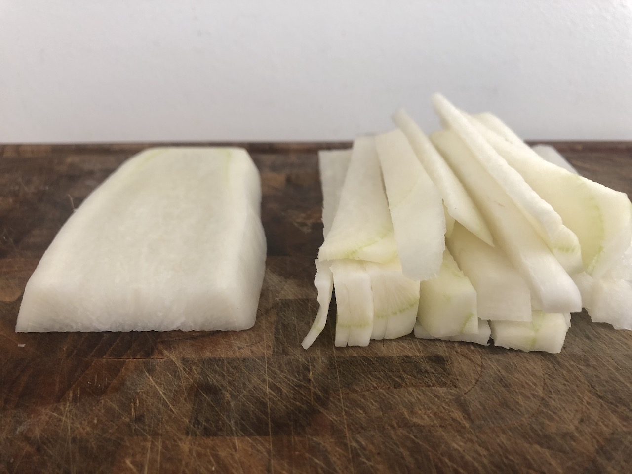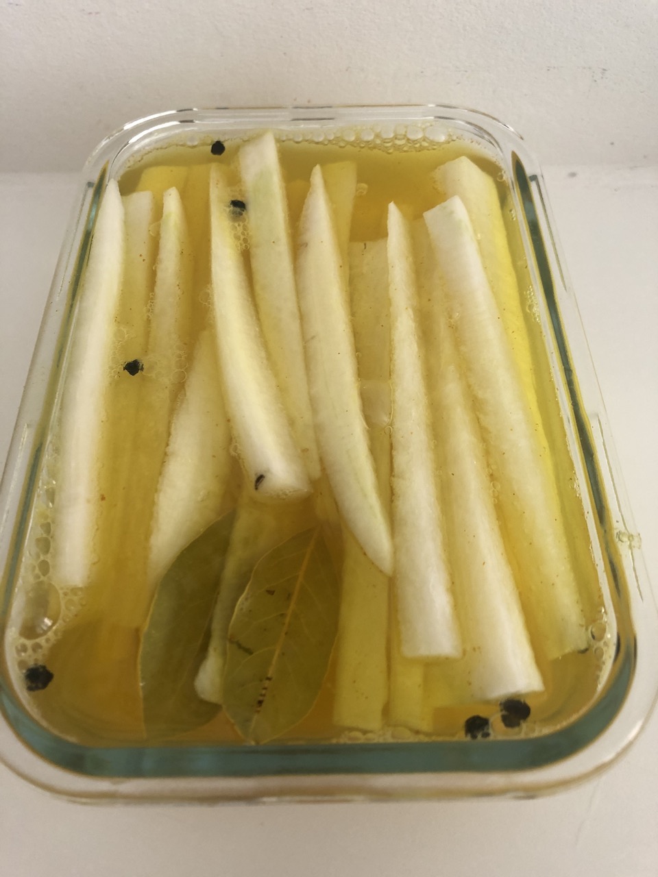 - Imens kan du skrælle kinaradisen, skære den i aflange stænger og lægge dem i en container med låg